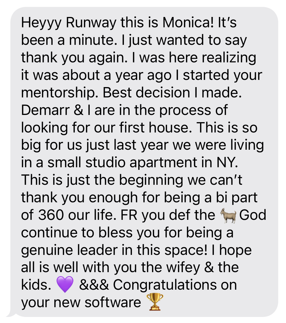 I have been fortunate enough to work with Runway in a coaching capacity and I can confidently say that he is one of the best! Not only do I consider him like a brother, but his expertise is truly incomparable. From the invaluable advice he's given me over the years to his knowledge of industry specific trends, I am forever blessed for having access to such an experienced resource. His coaching prowess knows no bounds, and I am proud to write this glowing testimonial in affirmation of that!